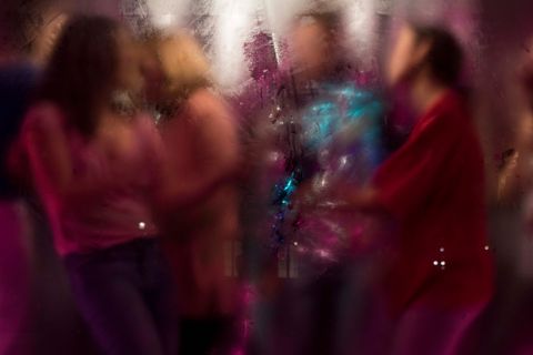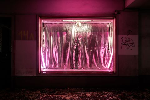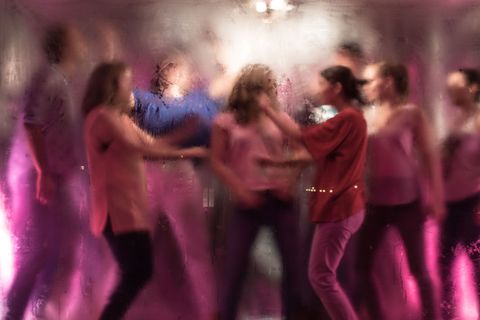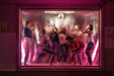 , 2018, Performance, 25 min, SaarbrückenEine Gruppe von Performer*innen tanzt ekstatisch in völliger Stille in einem Schaufenster. Das Schaufenster befindet sich unmittelbar vor einer Bushaltestelle, an der abends im 10-Minuten-Takt Berufstätige aussteigen und vor ihrem versinnbildlichten wie auch tatsächlichen Feierabend stehen.