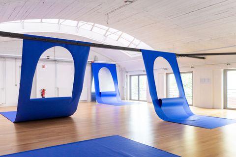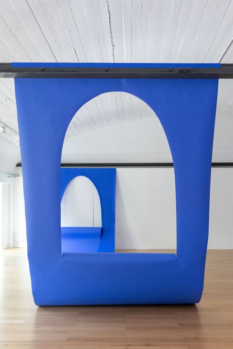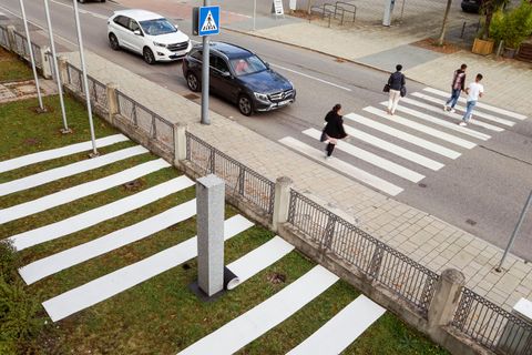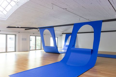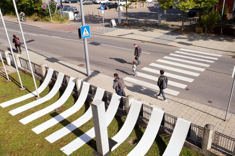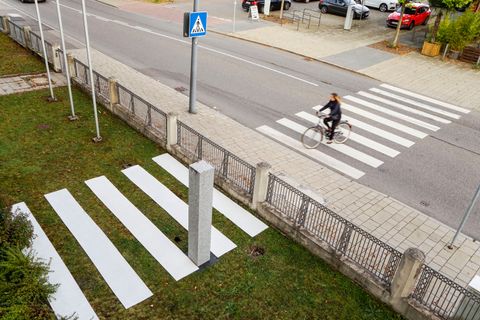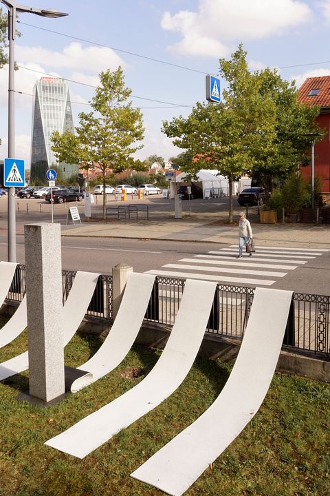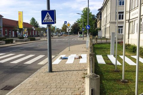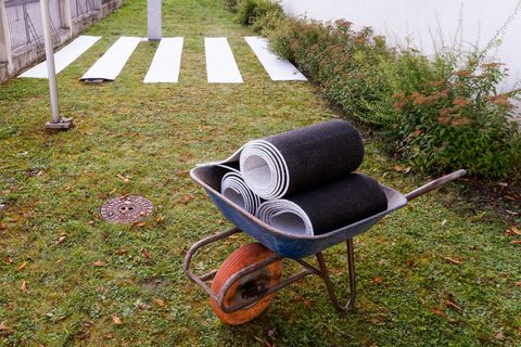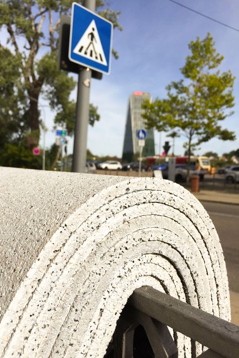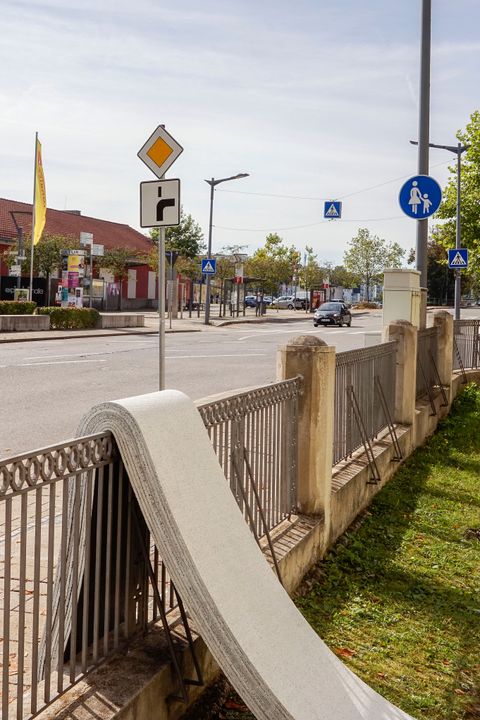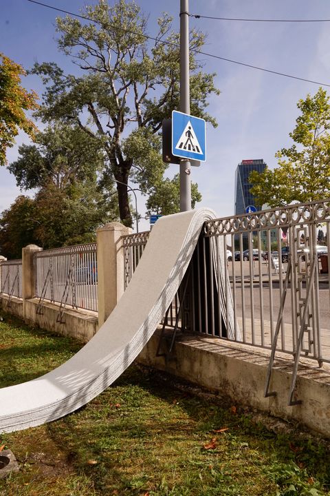 , 2021, Installation, Bautenschutzmatten, Markierungsfarbe, Städtische Galerie Villingen-SchwenningenAusgangspunkt der Arbeit Querung ist der Fußgängerüberweg zwischen dem Galeriegebäude und dem gegenüberliegenden Bahnhof. Vor Ort erkunde ich die Räumlichkeiten und urbane Dynamiken im Hinblick auf folgende Fragen: Wie bewegen sich Menschen durch einen Raum? Wie werden sie geleitet? Wer weicht wem aus? Wie unterscheiden sich Hierarchien der Bewegung im öffentlichen und musealen Raum? Den Fußgängerüberweg verdichte ich als Verkehrszeichen in reduzierter Form durch neun weiß gestichene Bautenschutzmatten. Diese werden neu entfaltet, verschoben, gedreht und performativ bespielt. Mal in Reihe, mal übereinander gestapelt wird er über den Zaun der Galerie gelegt. Mit diesen zeichnerischen Gesten wird die Grenze zwischen öffentlichem und musealem Raum markiert und untersucht.