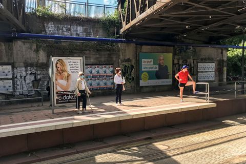 , 2019, Installative Performance, 7 Tage, SaarbrückenDrei Performer*innen gehen mit gleichmäßiger Geschwindigkeit zu unterschiedlichen Tageszeiten auf elektronischen Laufbändern in einem Schaufenster. Dieses liegt an einer Straßenkreuzung, die eilig schreitende sowie flanierende Passant*innen zusammenführt. Parallel zu den Laufrichtungen der Passant*innen fügen sich die Performer*innen als stilisierte Versionen dieser ein und beeinflussen deren Dynamik. Es entsteht ein transparentes Bild mit zwei gleichwertigen Schauseiten. Pacing and Passing ist Teil der Projektreihe Public Picture.