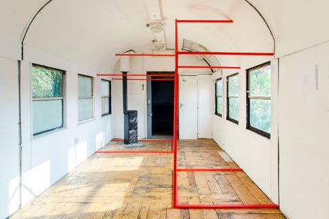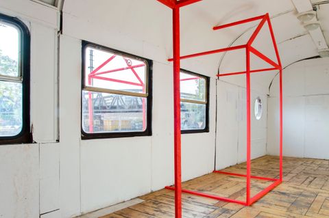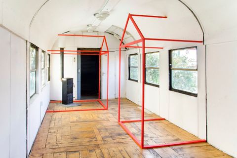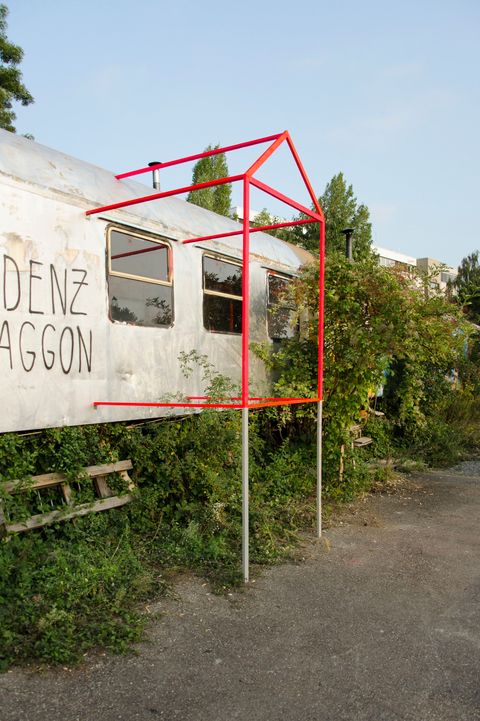 , 2020, Rauminstallation, Raumstation Waggons am Nordbahnhof Stuttgart#hausimhaus zeigt meine Auseinandersetzung mit Alltagschoreografien von Mensch und Tier im bewohnten Raum, dessen Durchlässigkeit und Beanspruchung sowie mit dem Hausen und Wohnen an sich. Im Zentrum steht eine Raumzeichnung, die sich über die Raumgrenzen des ehemaligen Bahnwaggons hinwegsetzt und Raumzuschreibungen wie Draußen und Drinnen permanent umkehrt. #hausimhaus zeigt außerdem Videoskizzen von Bewegungsabläufe von Tieren und alltägliche Objekte der Behausung.