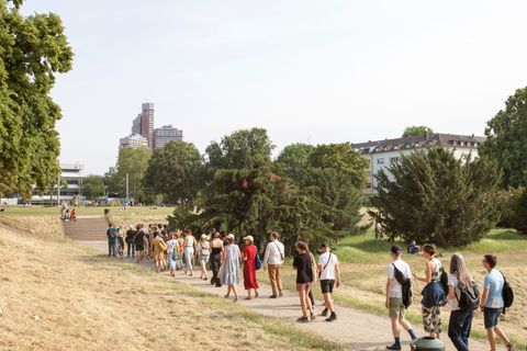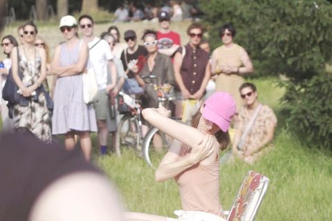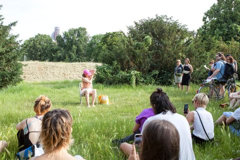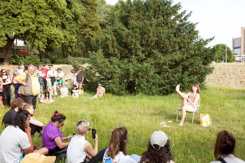 , 2023, Performance, Das sogenannte Draußen, AIC-ON-Spaziergang, Innerer Grüngürtel KölnDie Performance rückt den Bewegungsablauf des Eincremens mit Sonnenmilch in den Fokus. Zwischen funktionellem Akt und intimer Fürsorge umkreisen und umhüllen die Hände den Körper. In der Selbstberührung nimmt die Akteur*in immer wieder neu Haltung zum eigenen Körper ein. Sensitive Expert befragt das Verhältnis zum eigenen Körper und Bedingungen körperlicher Zuwendung im öffentlichen und privaten Raum.